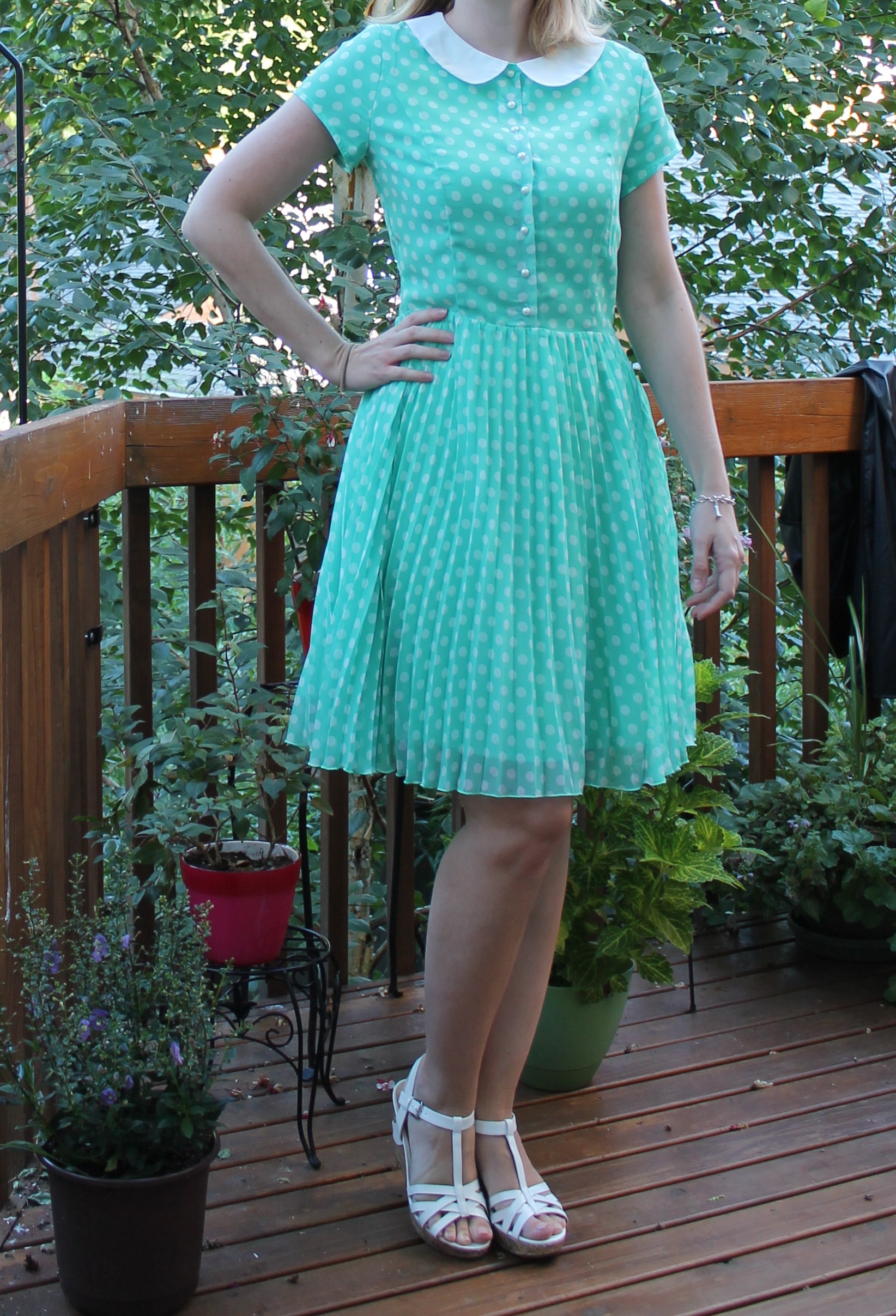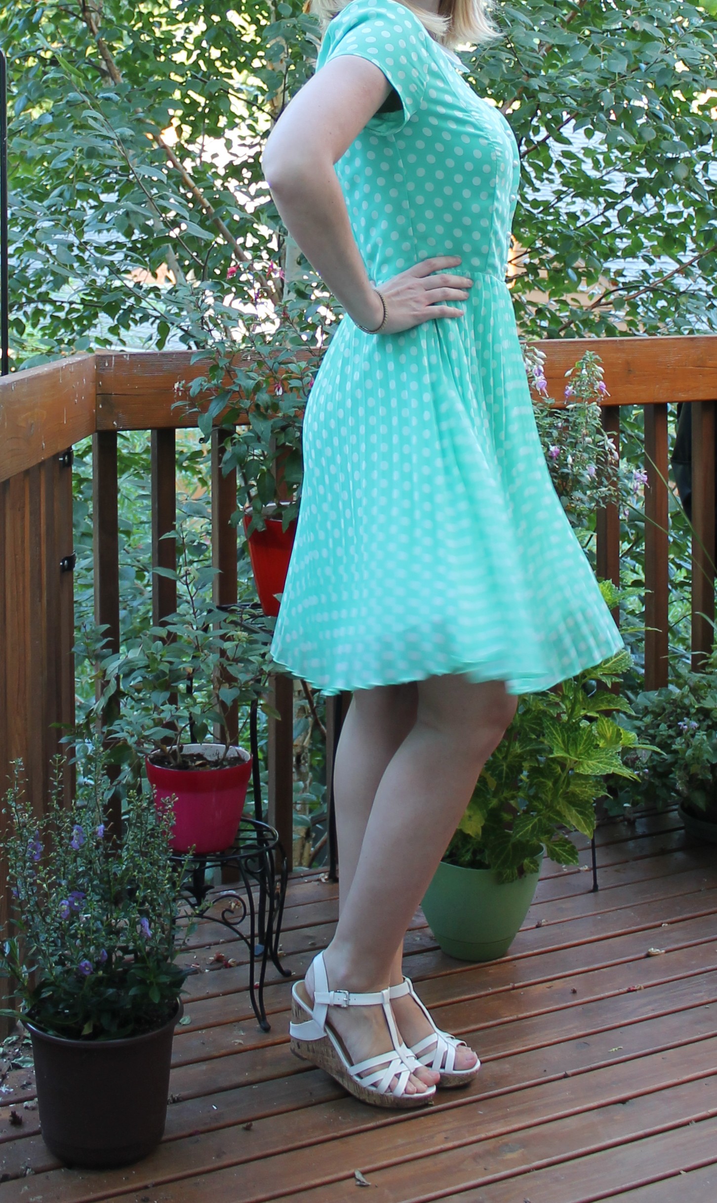 I didn’t even realize it when I picked this dress out yesterday morning, but it also has polka dots.  Maybe I’ll try for a week of polka dots?  I bought this dress last year from Shabby Apple and love the adorable Peter Pan collar and swingy skirt.  (See the second “action” photo.)  The lovely mint color is set off by the white polka dots and I felt a bit like a walking confection.  The fitted upper half combined with the swingy skirt work perfect for a pear shape and helped to balance me out.  I love this dress.