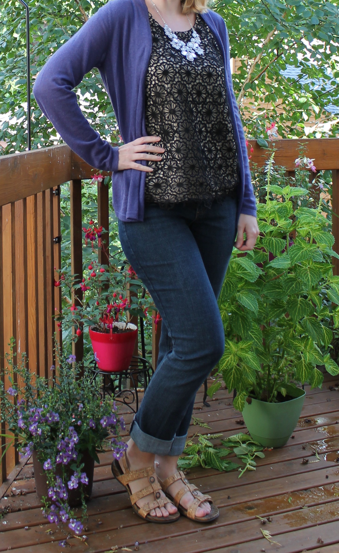 Today I wore one of my stitch fix items I kept from the last fix with an open purple cardigan and rolled up jeans. It worked well for a cool fall day.