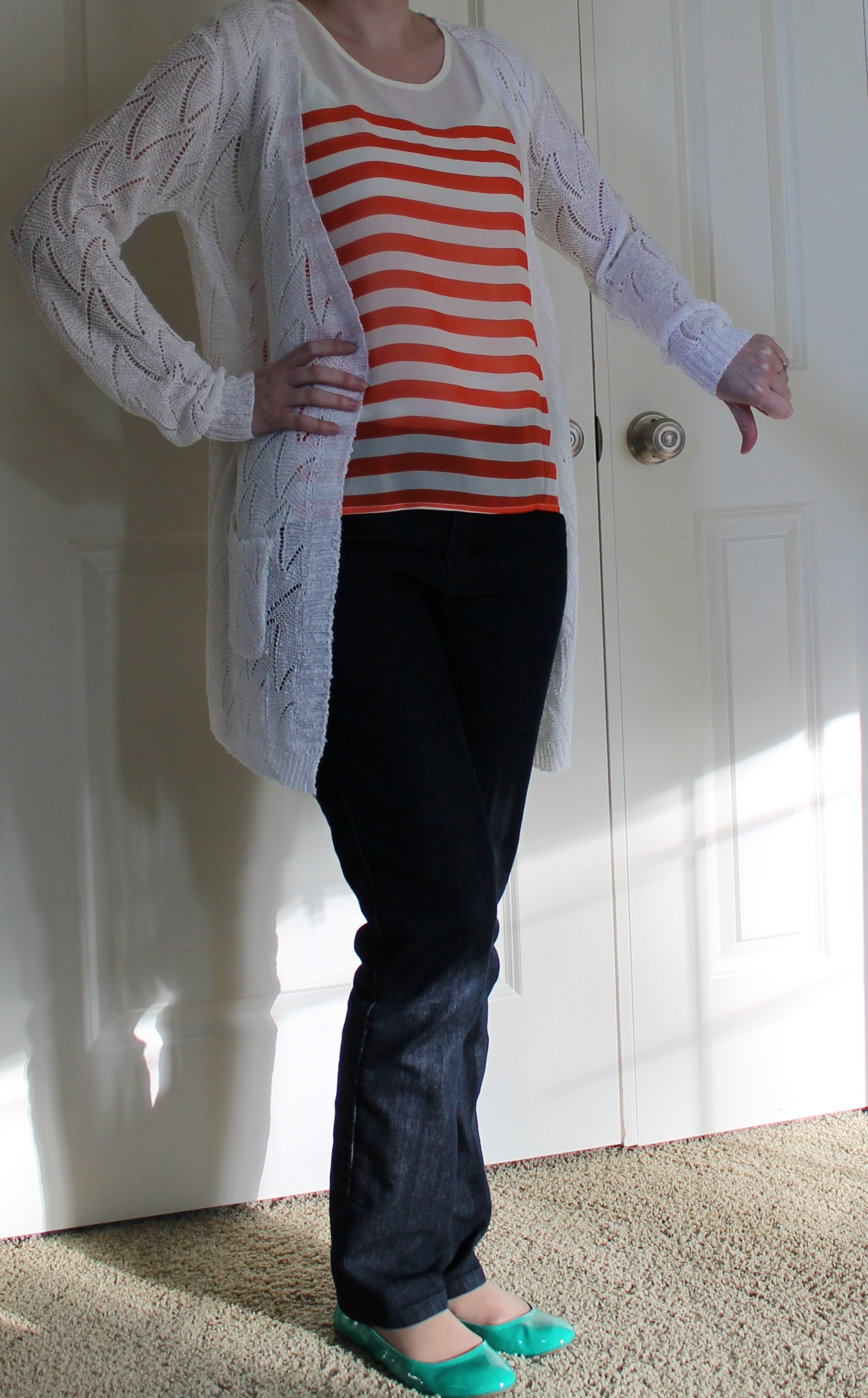 I really like the colors of this blouse, and it matches well with this lightweight cardigan I already had from Piperlime. It has a cute zipper in the back but you’ll probably never see it because it didn’t look good on its own. I decided to keep this piece because I love stripes and the color and think it will look good with jean jackets and cardigans.