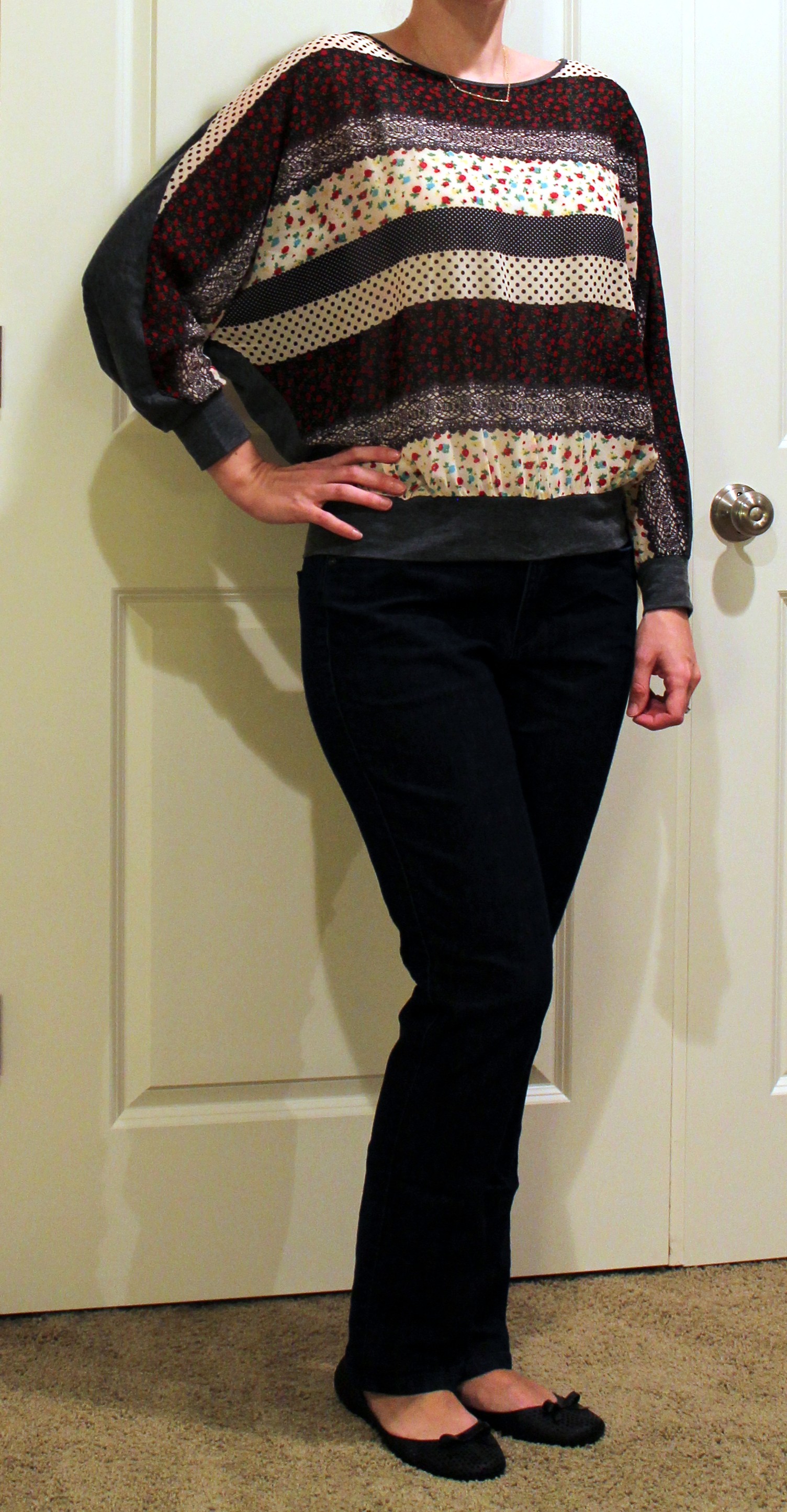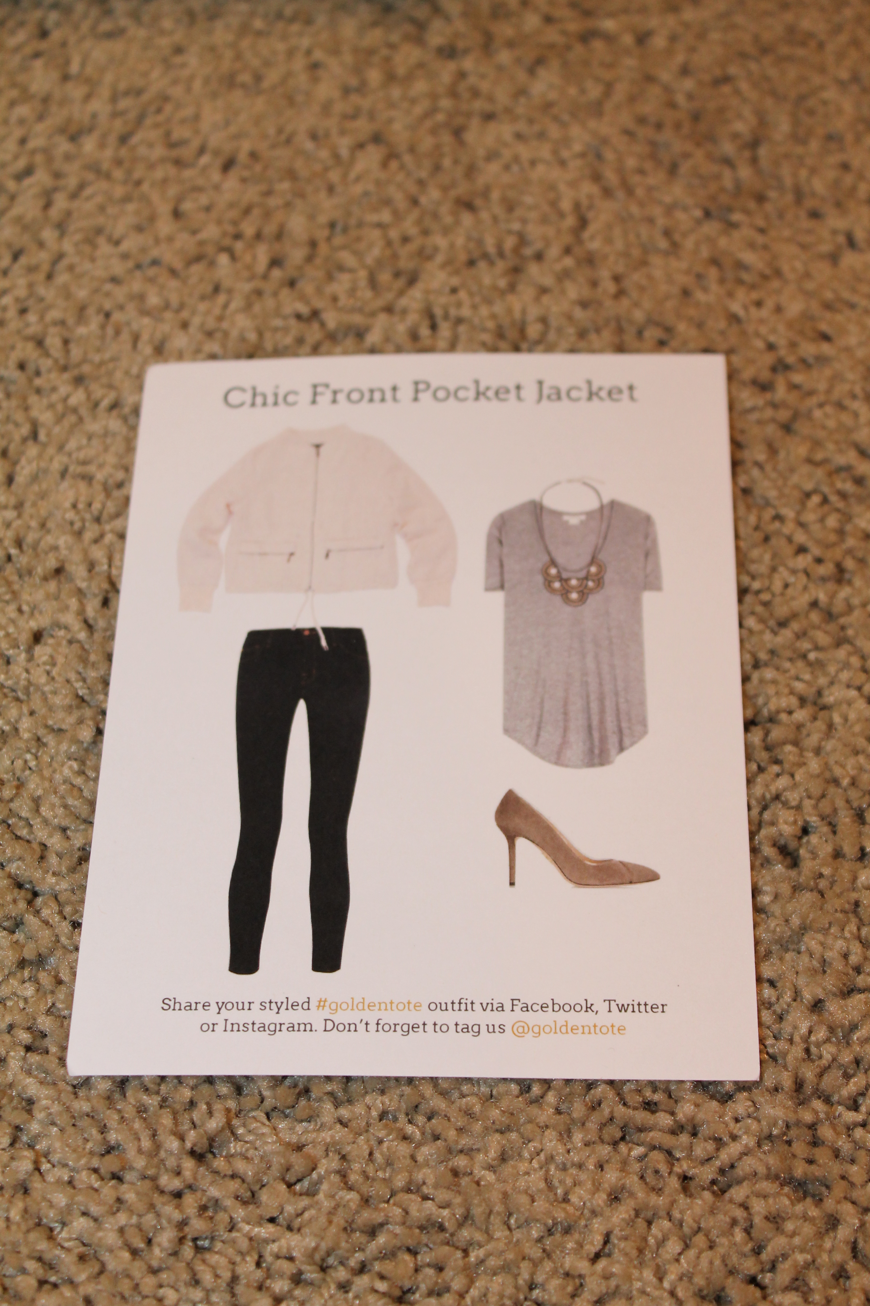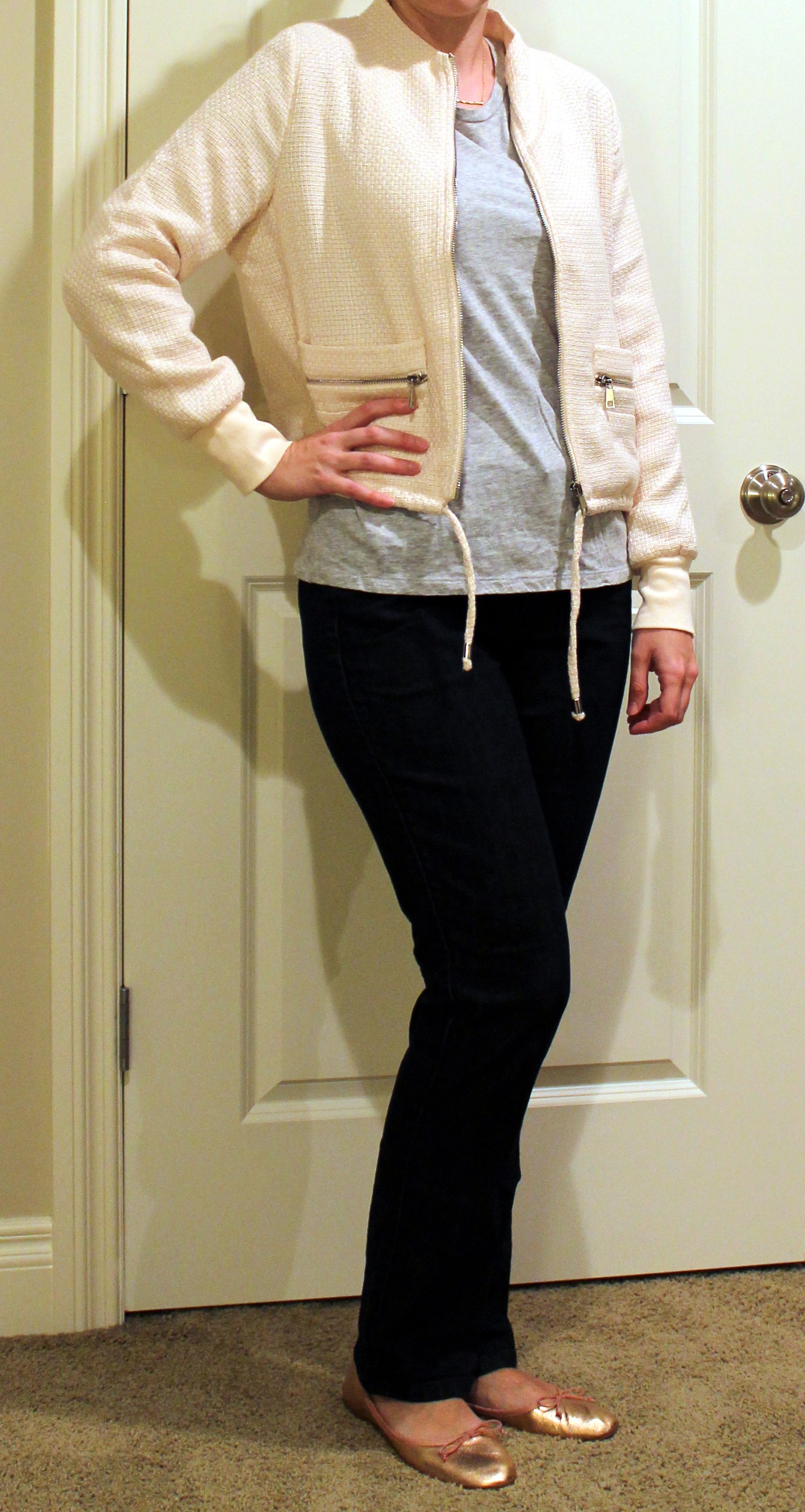 I attempted to style this similar to what they did on the card. I didn’t have a necklace like on the card but I’m sure I can dig up something similar. I just got these metallic pink ballet flats from Amazon and thought they worked with the outfit. The jacket is soft and comfortable so I imagine I’ll be able to wear it a lot.