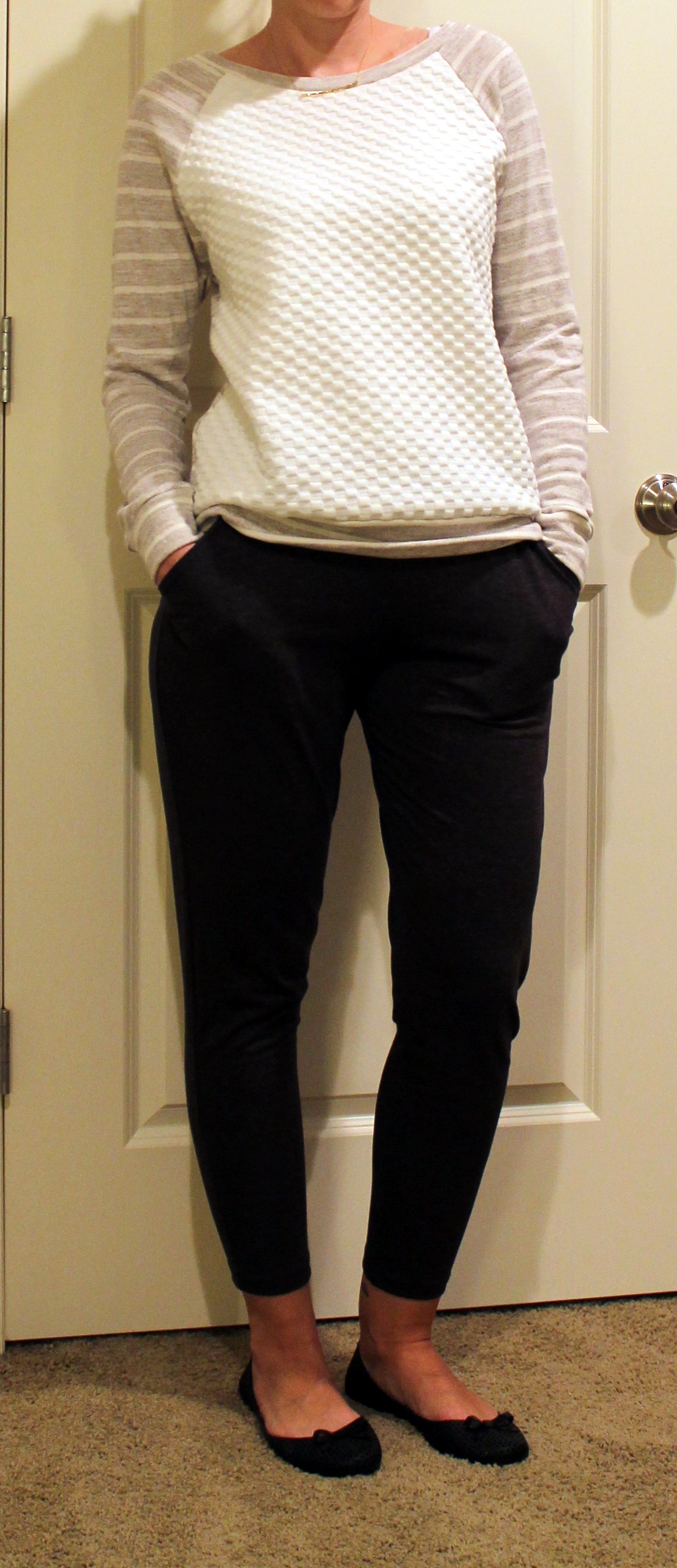 Again, these are super cozy and comfortable, but styling them will be a challenge. The blog suggested a tank and cardigan or a tank and high heels. I’m not sure I can make them look dressy, but I’ll see what I can make work because they are sooo comfortable.