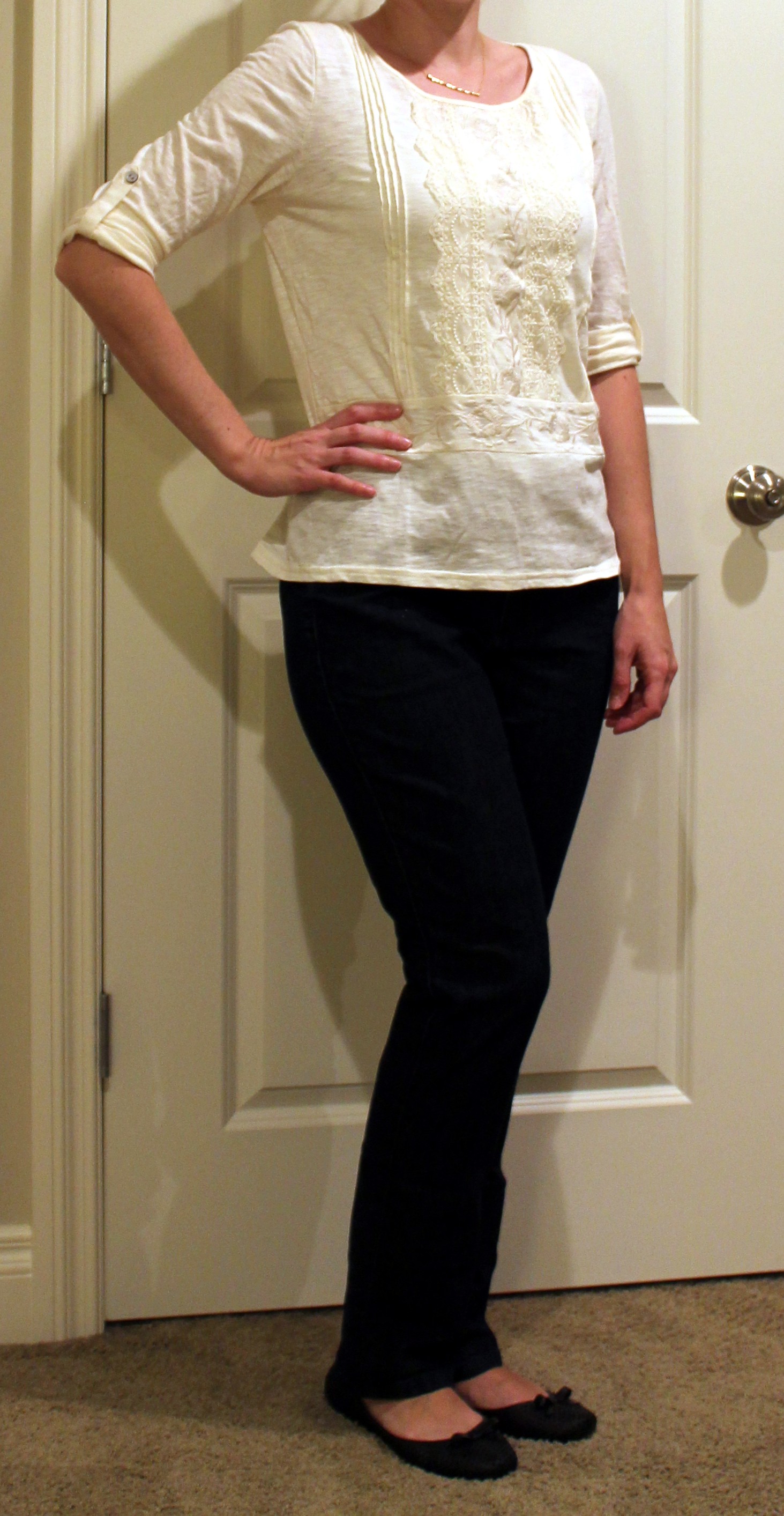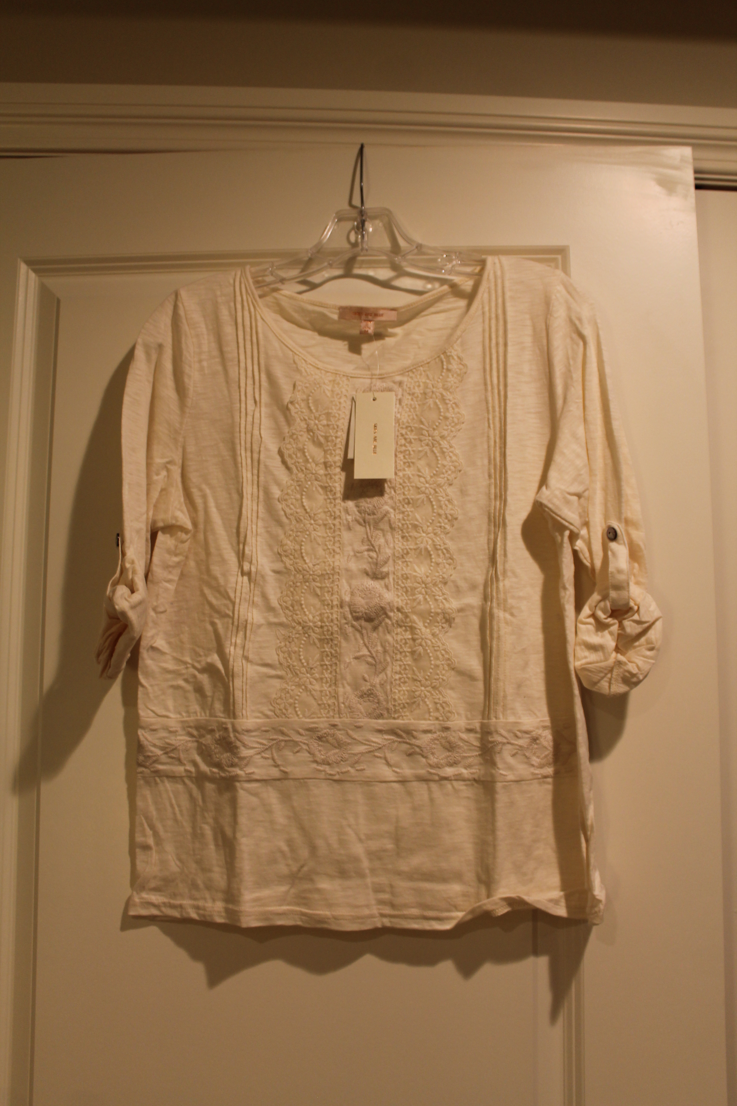 This was totally something you’d find at Anthropologie with a big price tag. I like the lace front and roll sleeves. Easy piece to layer with.