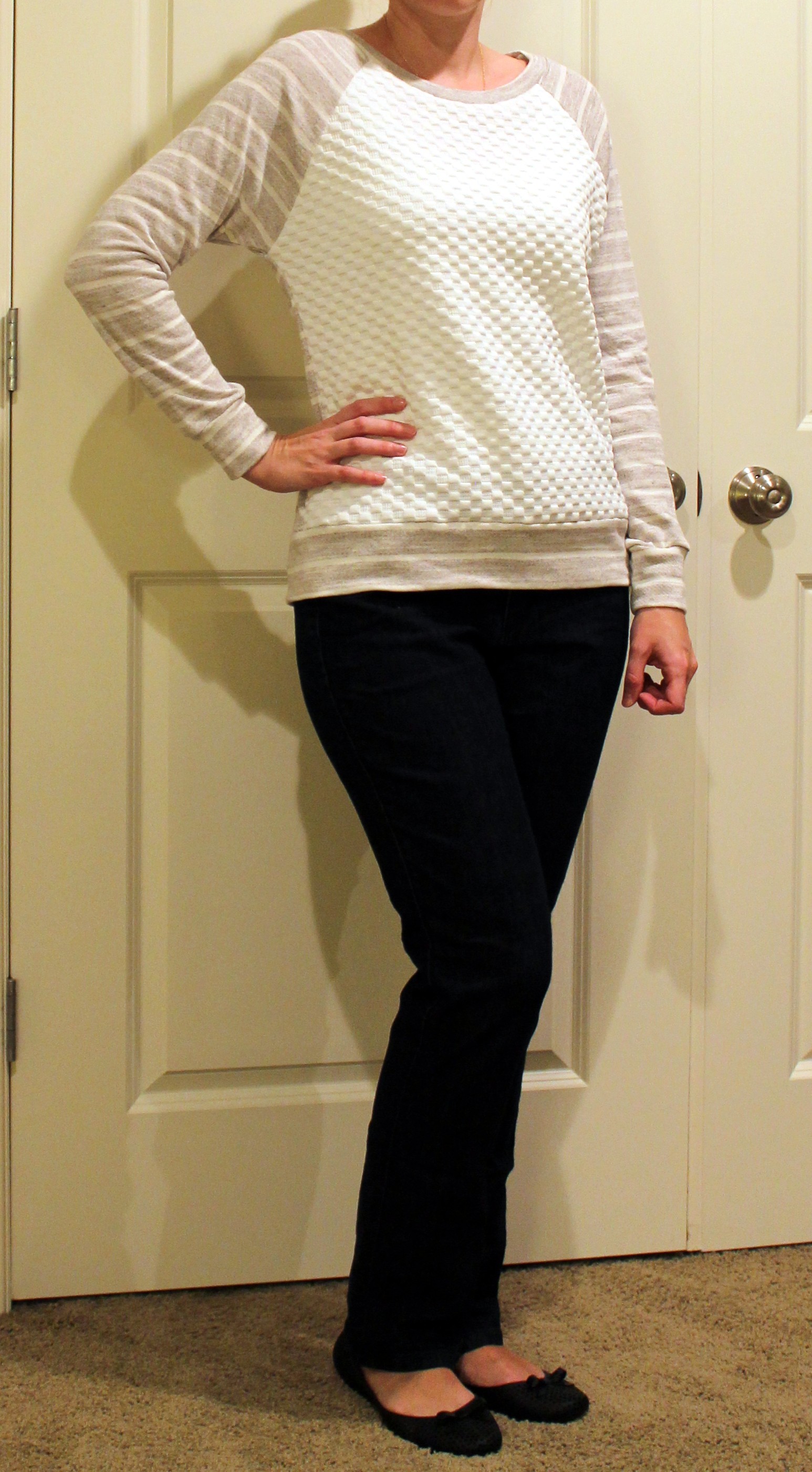 The front of the sweatshirt is super soft and it’s very cozy. The only thing I don’t like about it is how wide the neck is. If I’m wearing something warm like this, I don’t want a wide open neck to make me feel cold. I saw ideas on the blog to wear this with a chambray shirt underneath, so I may do that to stay warm.