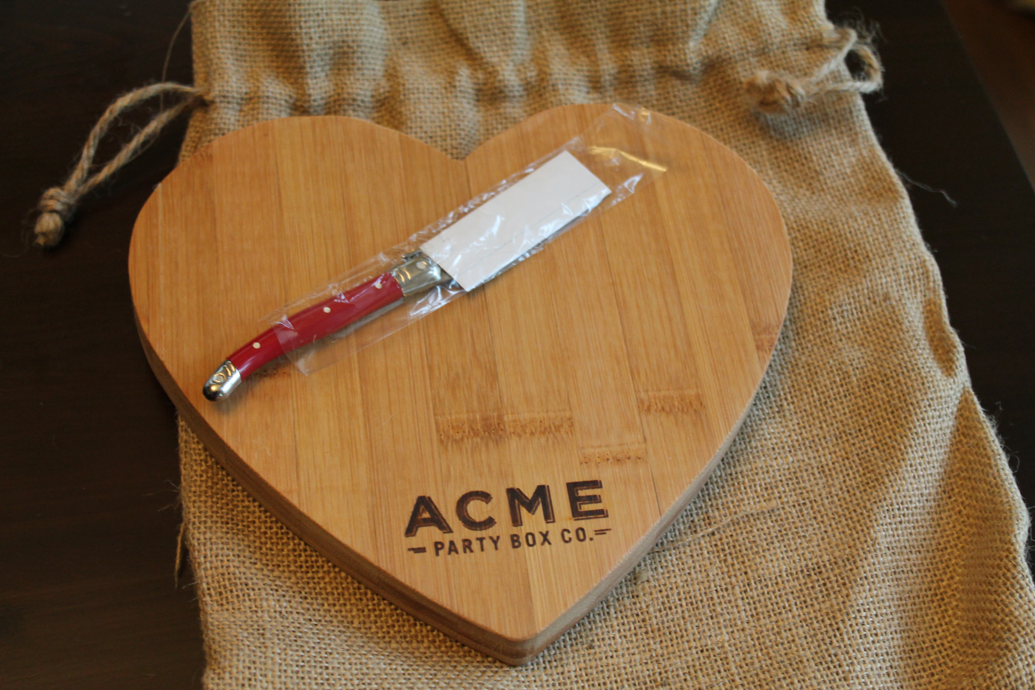 ACME Party Box Company – Bamboo Heart Cutting Board and Cheese Knife $32