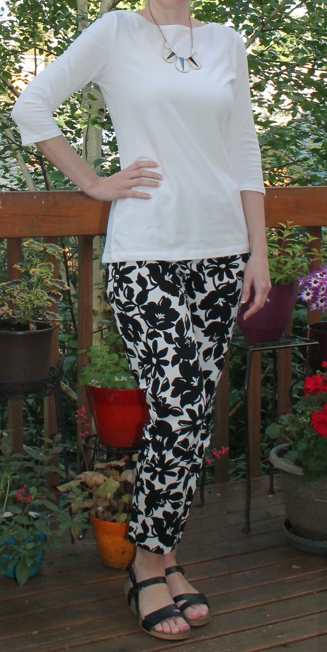 I found these curvy capris at Kohls and was so happy! Cute patterned pants that fit me, very rare. The top is from Target and the necklace an old stitch fix.
