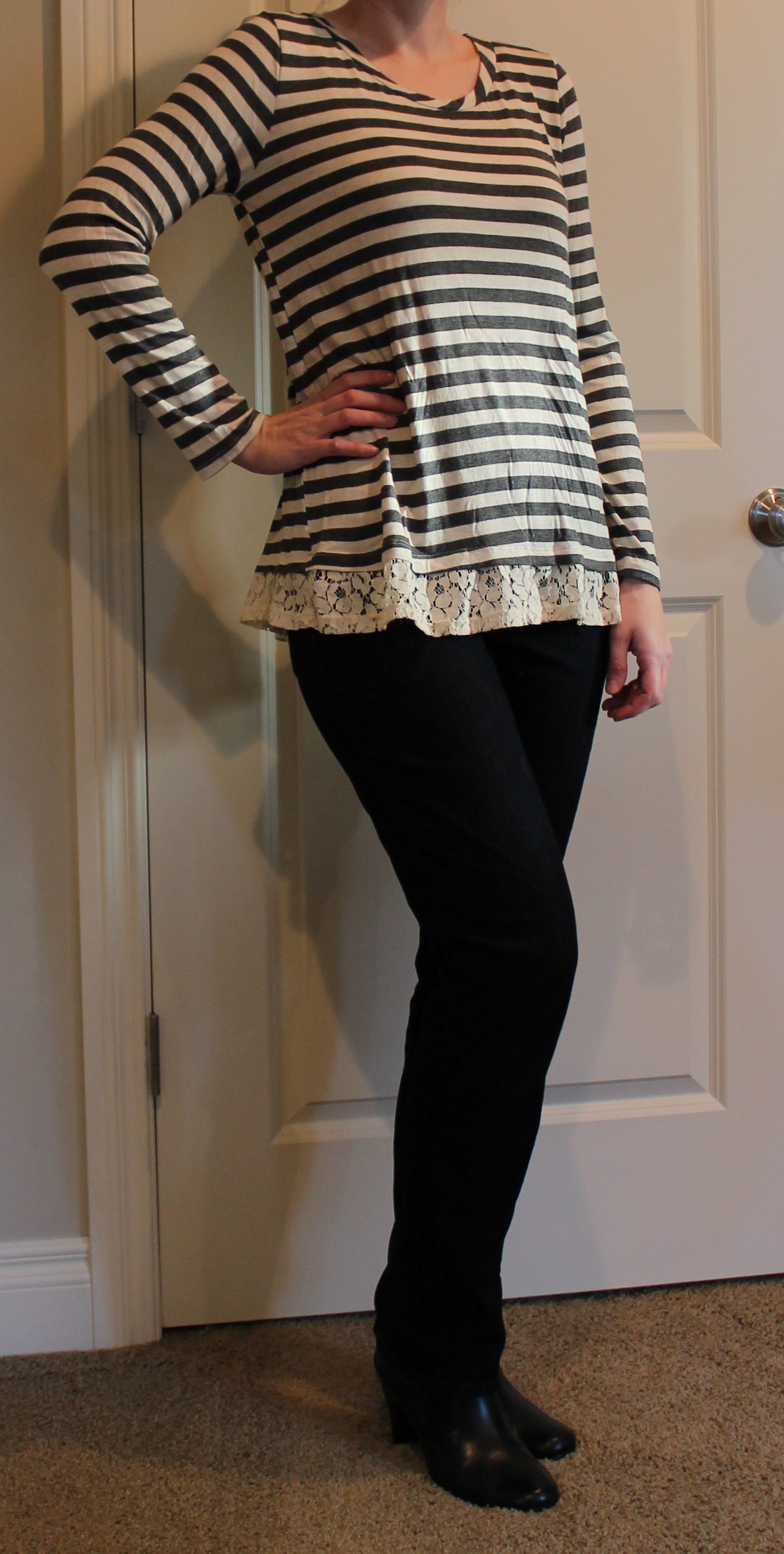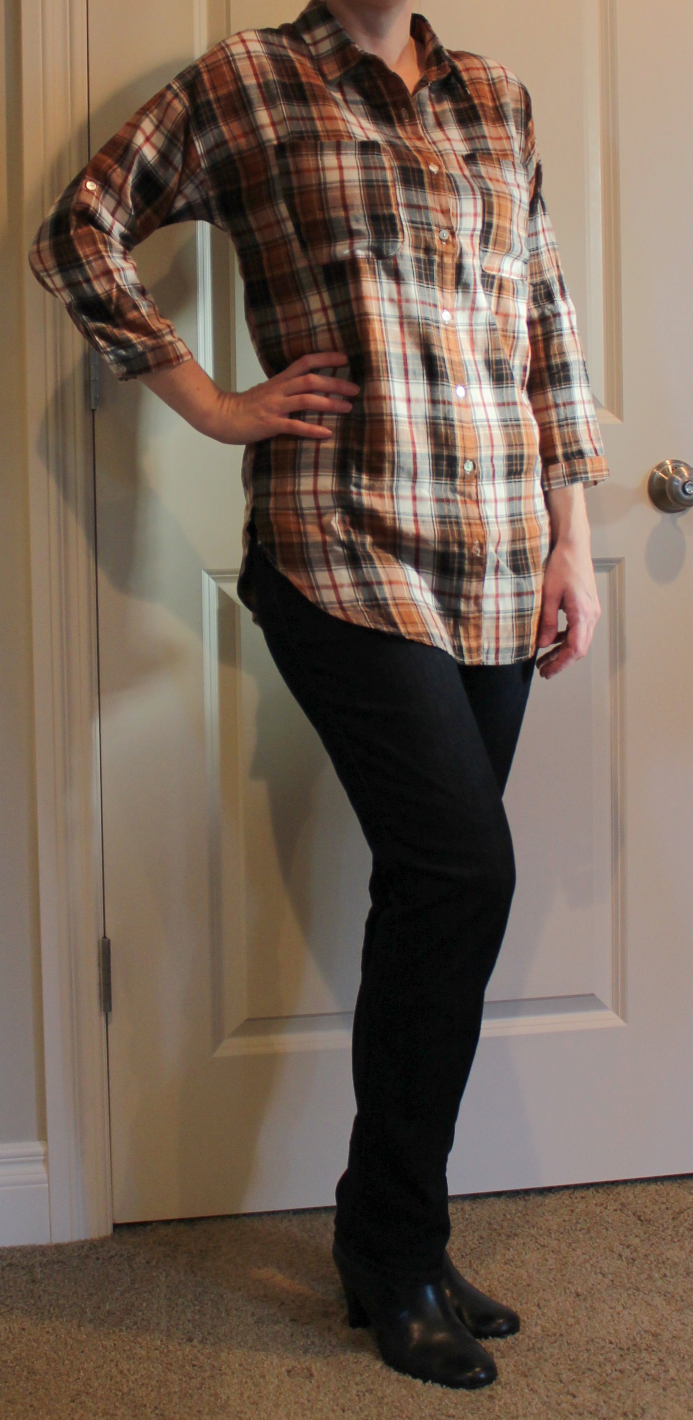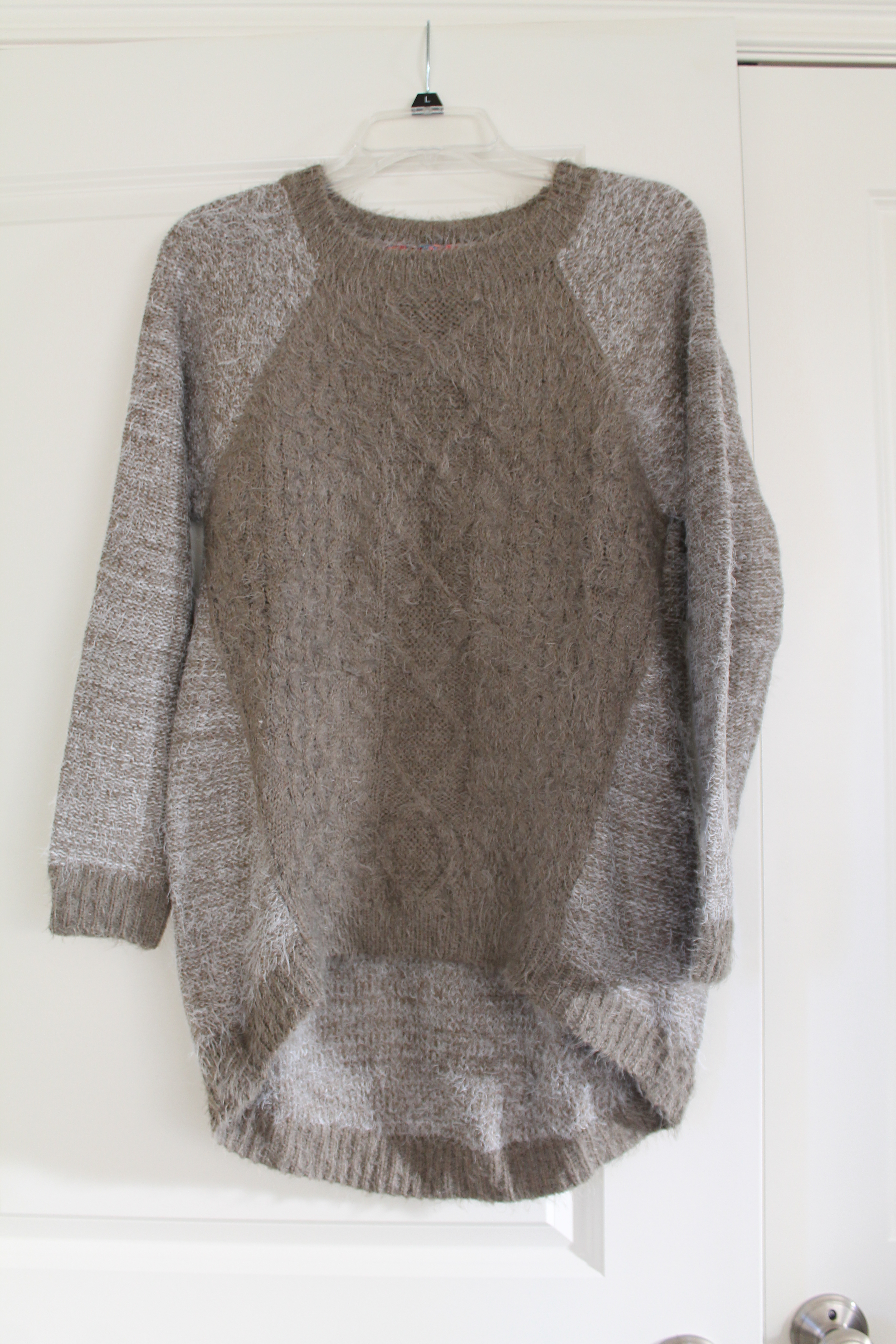 This is actually a hi-lo sweater and is super cozy and soft. Β I think it will look cute paired with my brown skinny jeans or black skinny jeans and boots.