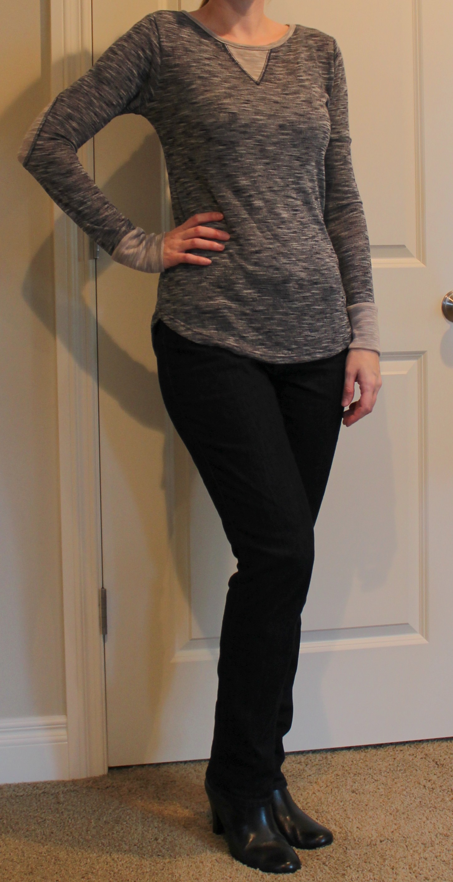 This top is soft and very thin which would require a top layer, but it’s almost too cute to cover up. Β It had nice little elbow patches. Β This is a keeper.