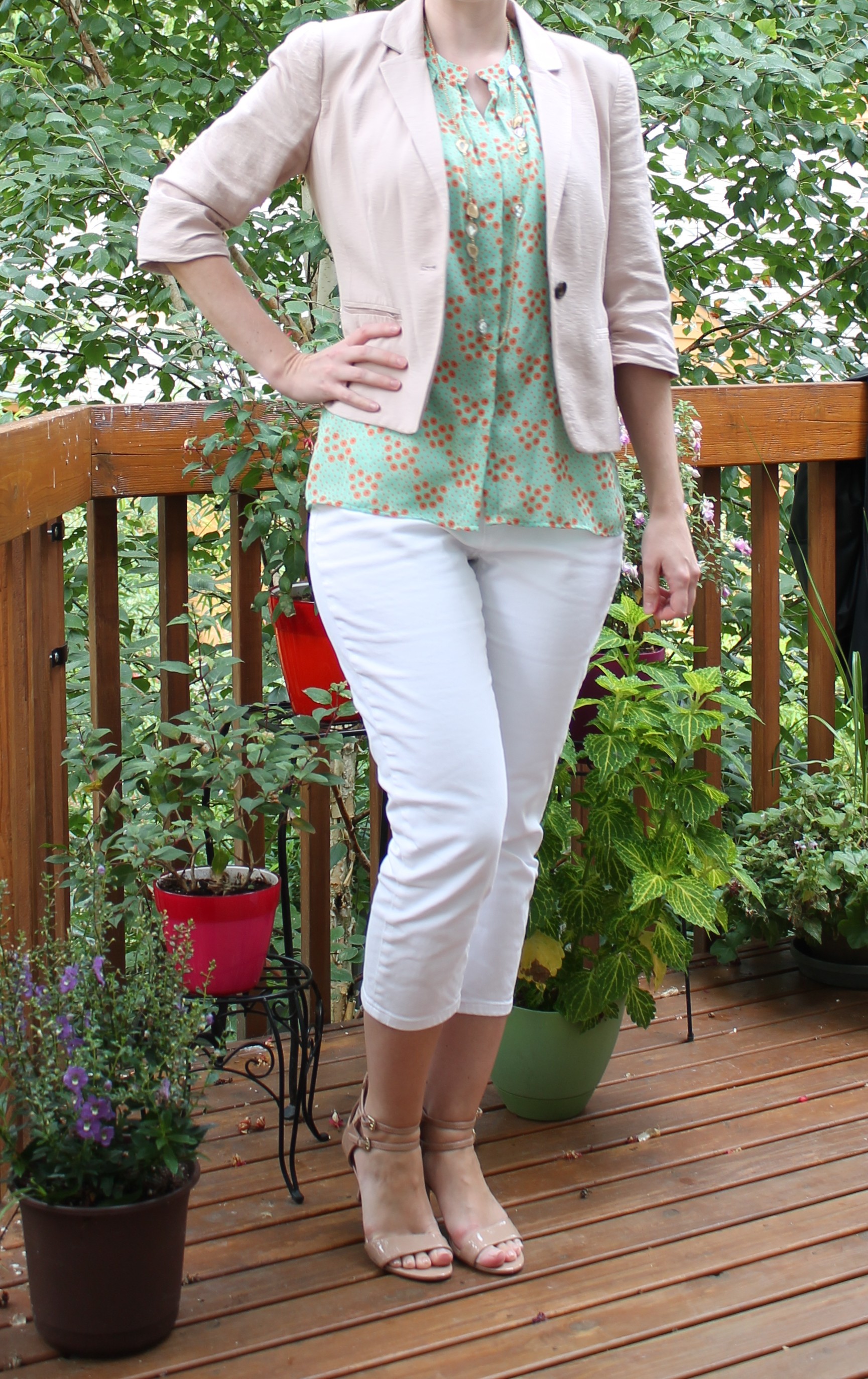 On Friday I wore one of the tops I kept from my last Tog + Porter box paired with an older dusty rose jacket and some white capri jeans.