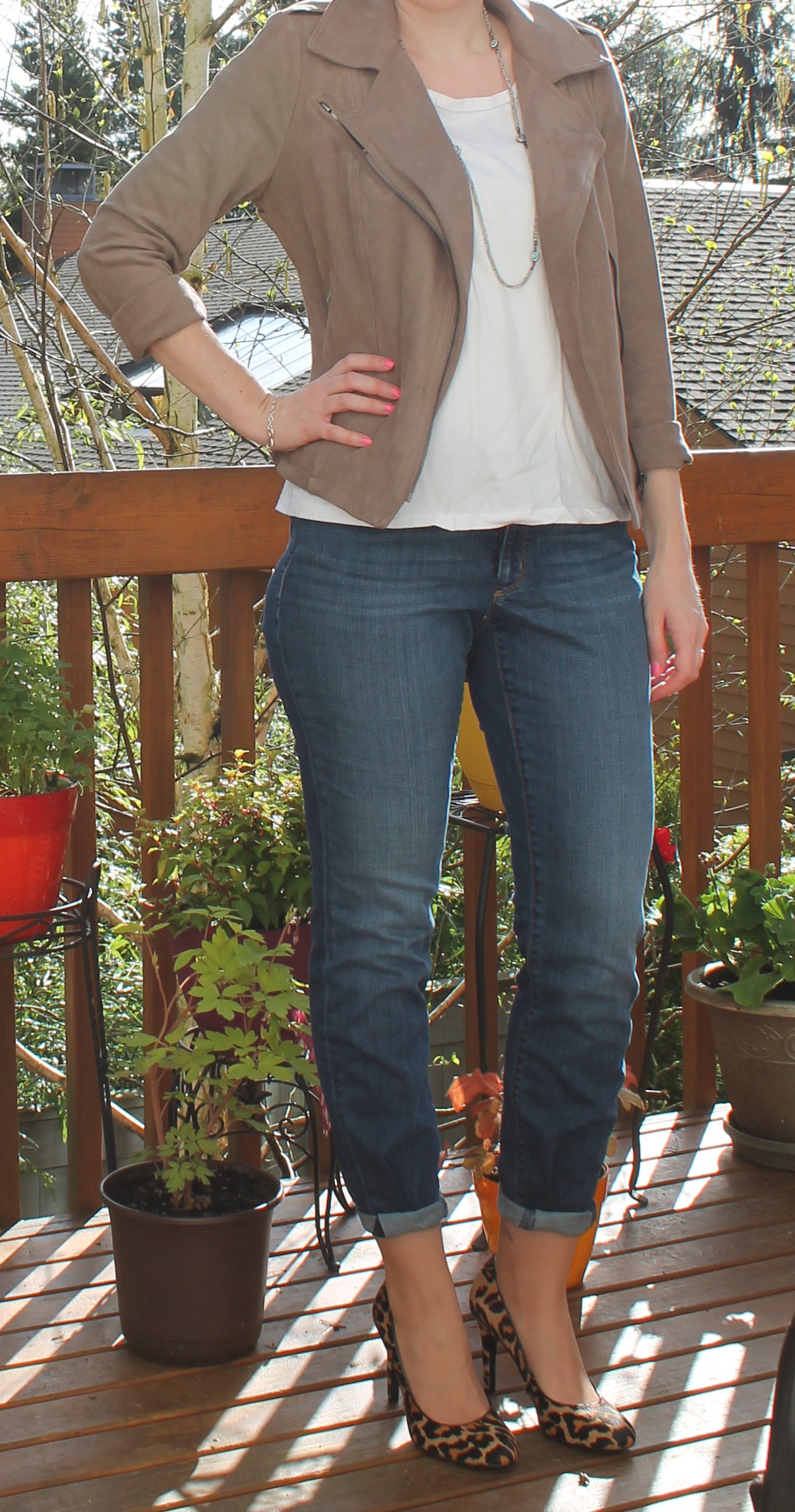 This was one of my favorite looks.  The faux suede jacket is from Piperlime and the pumps are Nine West.  I felt so chic!