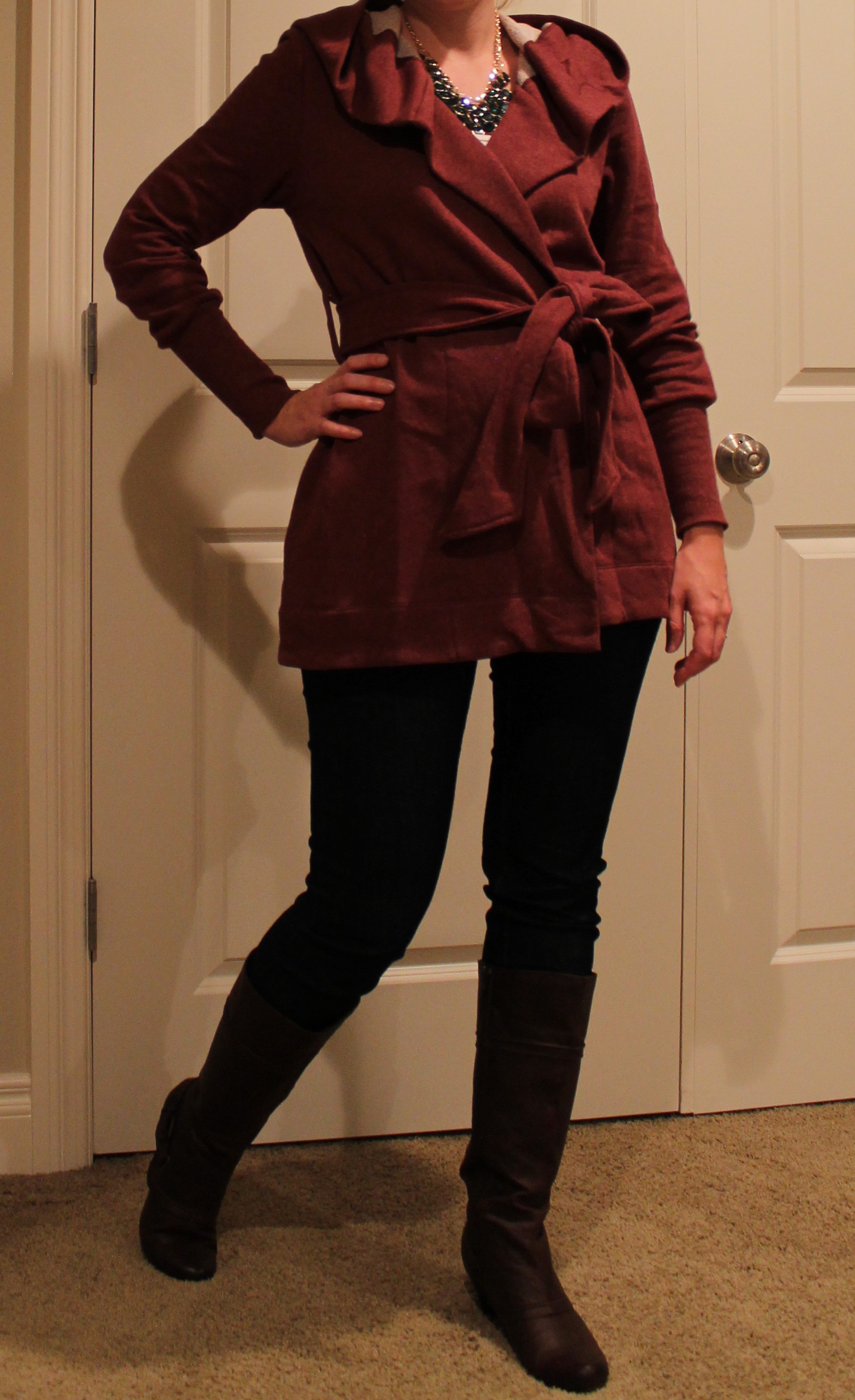 Hooded CardiganOkay, all joking aside, I did feel a bit costumey in this and it just didn’t really fit into the rest of my wardrobe.  The inner unfinished terry fabric is exposed at the neckline and it looks unpolished.  Not to mention I feel like I’m wearing a robe.  It’s long and bulky and I just can’t see myself wearing this.