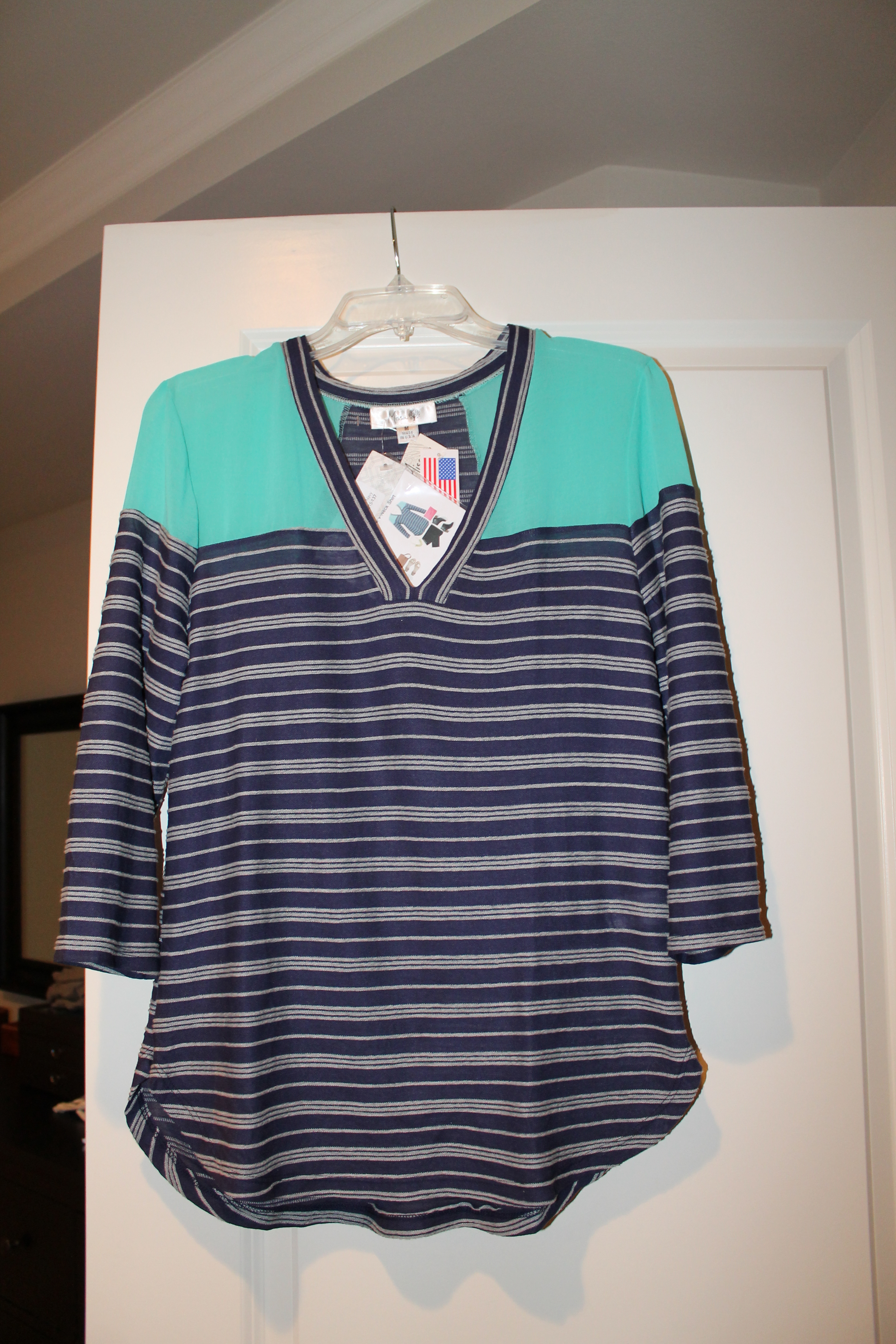 Missa – Koa Striped 3/4 Sleeve V-Neck Shirt – $68
