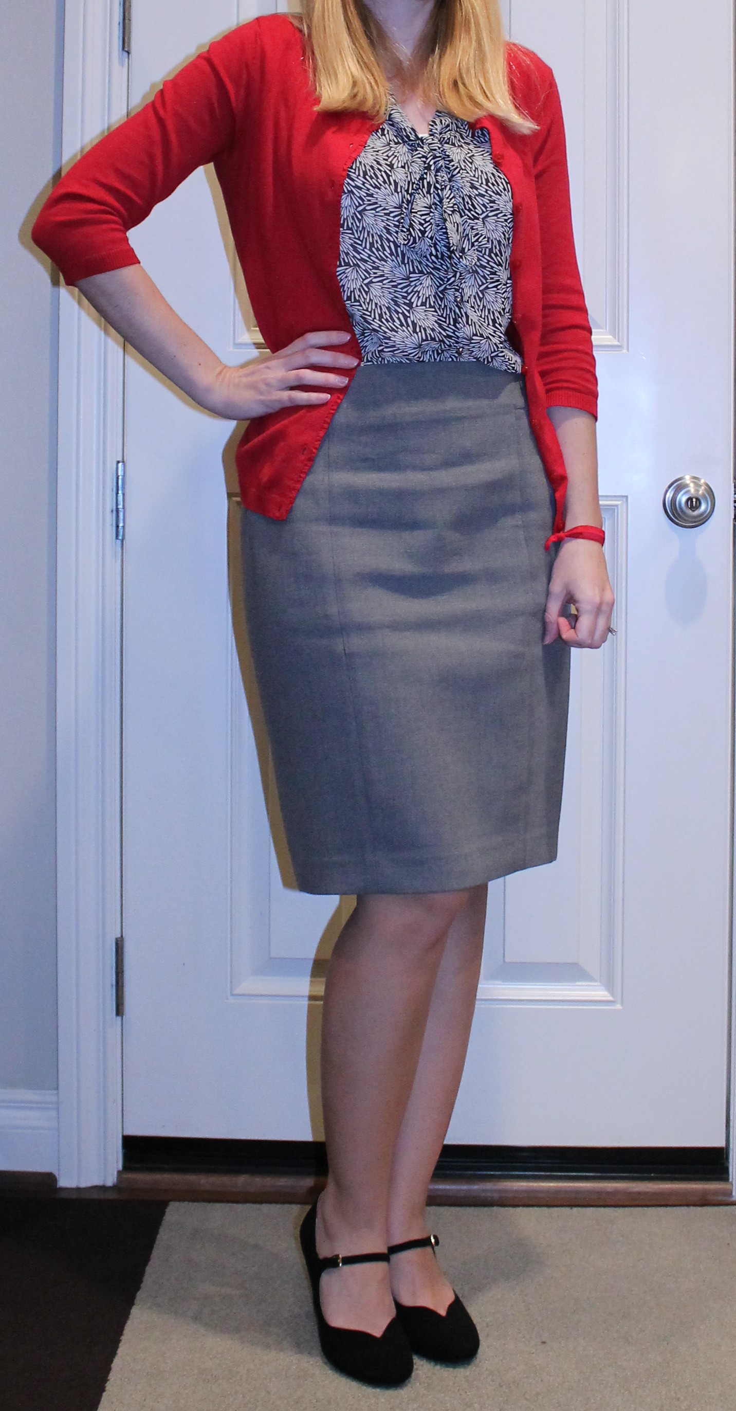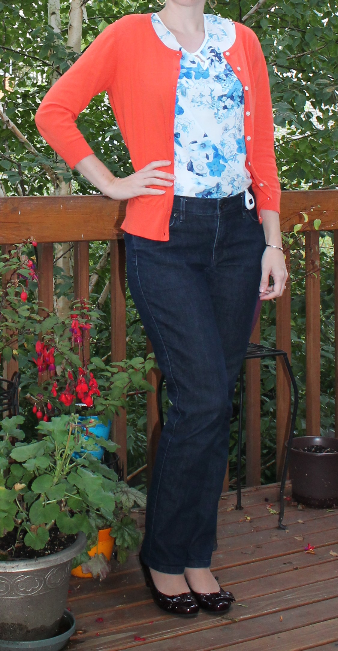 The best part of this outfit is the shoes. They are a nice low heel and I love the details. The jacket is older and the red shell is from Golden Tote as a surprise item. Jeans from Old Navy. I’m loving the new curvy skinny jeans, after I washed these they were a bit more fitted.